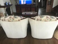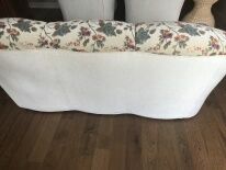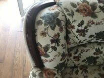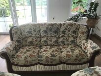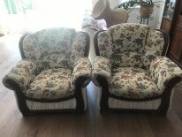 Masywny, duży komplet wypoczynkowy składający się z 3-siedziskowej kanapy i dwóch obszernych, wygodnych foteli z materiałową tapicerką w kwiaty z odpornego na ścieranie materiału i drewnianymi obramowaniami w kolorze brązowym na frontach kanapy i foteli. Kanapa nie jest rozkładana. Szerokość fotela 100 cm z oparciami, siedziska fotela 58 cm. Fotele i kanapa posiadają drewniane nóżki, wysokość mebli od podłogi do siedzisk to 38 cm. Wysokość oparć 60 cm. Meble mają kształt lekko rozchylony w części siedziskowej. Kanapa ma dł. 200 cm, szer. siedziska w kanapie to 53 cm, Każde pojedyncze siedzisko jest podzielone na trzy przeszyte części o lekko wypukłej konstrukcji. Wszystkie sprężyny w siedziskach sprawne. Drewno w obudowie raczej w dobrym stanie wizualnym. Zestaw stoi w salonie od 2015 roku, w międzyczasie był z powodzeniem czyszczony. Materiał tapicerski gruby i wytrzymały, sporadyczne zaciągnięcia , optycznie dobrze utrzymany, ale oczywiście ślady użytkowania są.Sprawdź zainteresowanie tym ogłoszeniem